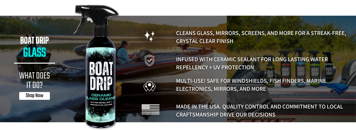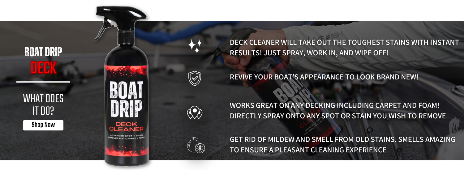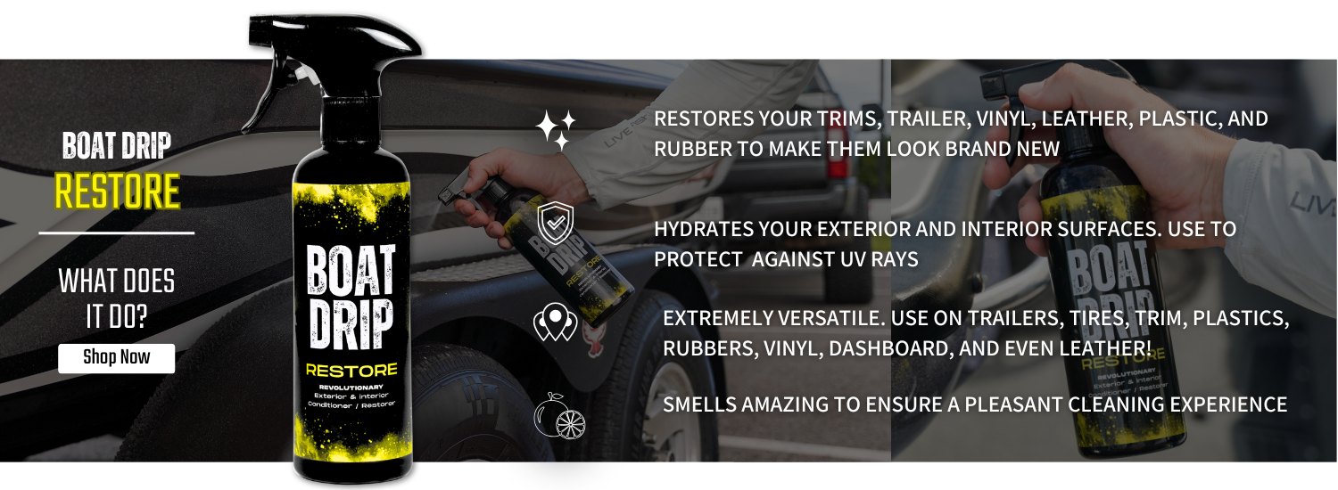 Boat Drip Exterior: Eliminates hard water spots, lake slime, and dirt, perfect for fiberglass, gelcoat, aluminum, plastic, chrome, glass, and all painted surfaces. Restore: Revives your trims, trailer, vinyl, leather, plastic, and rubber, making them look brand new. Deck Cleaner: Tackles the toughest stains with instant results—just spray, work in, and wipe off!