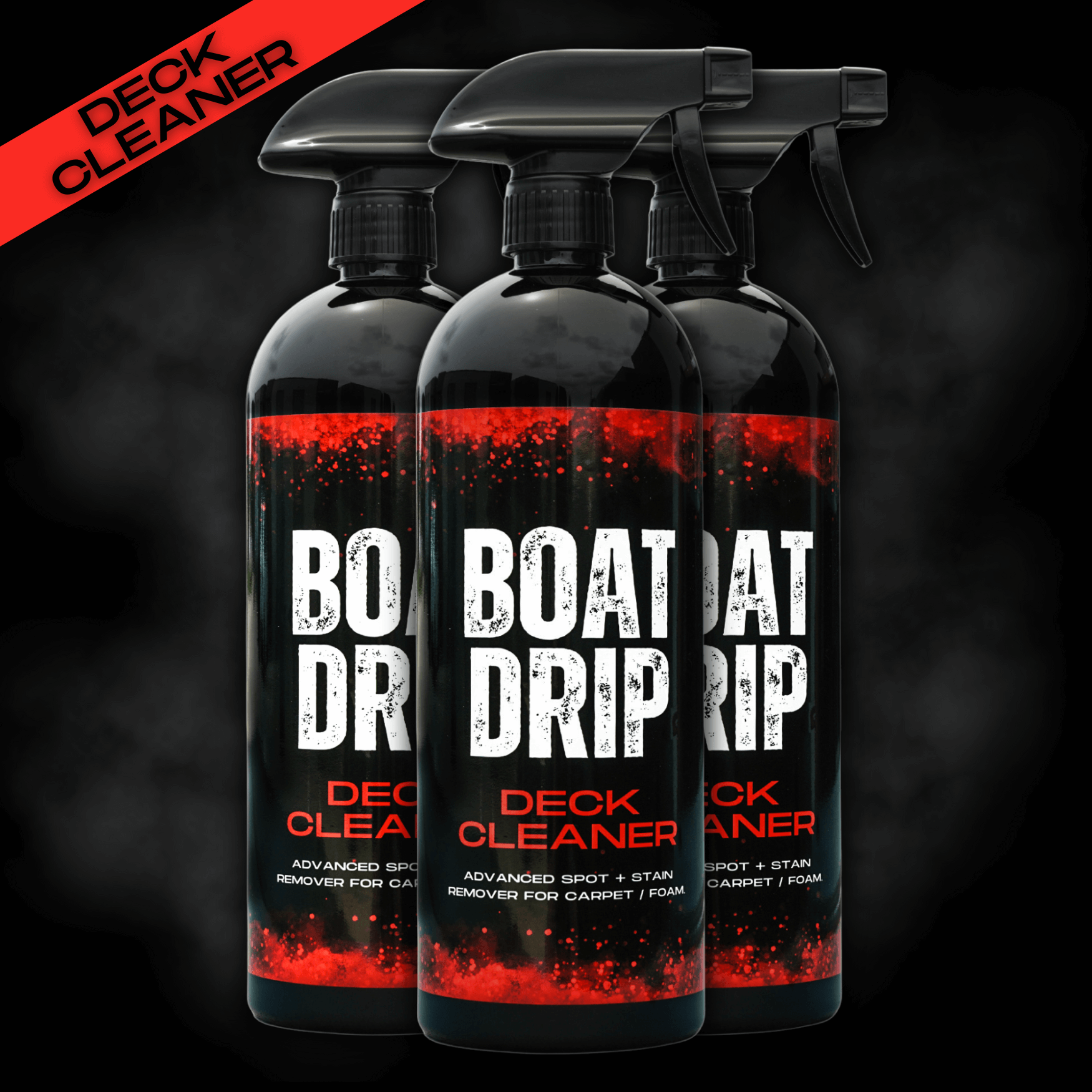 Boat Drip offers a premium 32OZ Deck Cleaner/Spot Remover that eliminates tough blood stains, mildew, fish slime, and dirt spots so your boat can look brand new again! Deck Cleaner works great on any decking including Carpet and Foam! Directly spray onto any spot or stain you wish to remove. Next, agitate the spot with a carpet brush in a circular motion, Allow for the solution to penetrate the stain. Wipe the surface with a clean towel and let it dry. Our formula is specifically designed to remove those spots/stains like fish blood that any ordinary cleaner can't get out. Not only does this stuff work great but it also smells amazing!