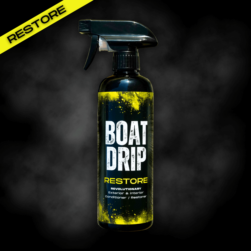 Our revolutionary 16oz exterior/interior Restore spray is here! Our innovative formula effectively restores your trims, trailers, and seats to make them look brand new. Chemically infused to protect surfaces and bring back that original look your boat/trailer once had. Spray on any rubber, plastic, or leather material and wipe evenly with a clean rag or pad. Restore dry's instantly and does not leave any oily feel behind. Not only is Restore water resistant to ensure it keeps your surfaces looking brand new but it also smells amazing. Grab a bottle today and we guarantee this will be your new favorite boat-cleaning product!
